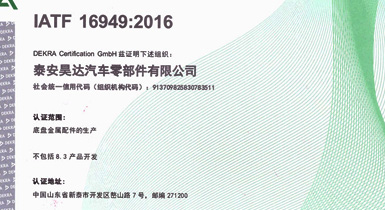 公司擁有IATF16949:2016國際標準質量管理體系認證,精良的設備、先進的生產工藝及完善的質量檢測保證了公司產品的可靠品質...